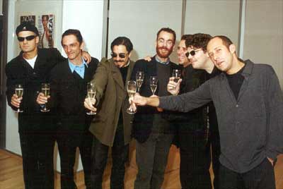 Marcelo Fromer, à dir., junto com os Titãs brindando o contrato com nova gravadora